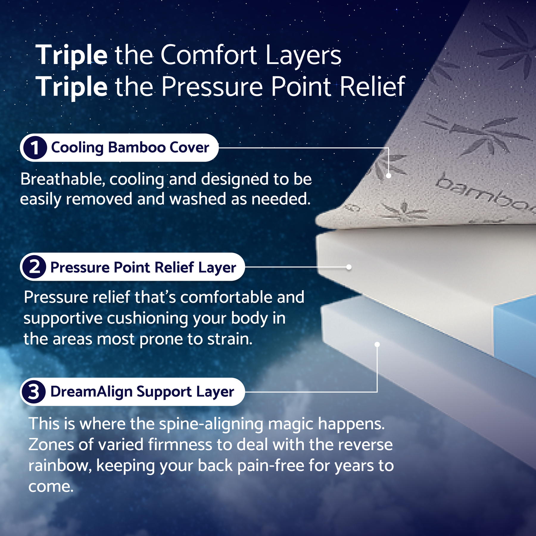 • One-of-a-kind layering. From the outside in, our double memory foam and cooling bamboo cover feels luxuriously soft and cool, while ALSO providing deep support and a world-class sleep experience.